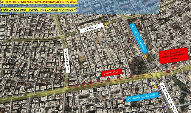 Antalya Büyükşehir Belediyesi Fen İşleri Dairesi Başkanlığı tarafından, Muratpaşa İlçesi 100.Yıl Bulvarı üzerinde altyapı kurum ve kuruluşlarının çalışmalarından dolayı deforme olan yolda etaplar halinde yapılan asfalt yapım çalışmaları sürüyor. Çalışmanın 3. etabı 15 Şubat Pazar günü gerçekleştirilecek. Çalışma kapsamında 100. Yıl Bulvarı’nın ( Şehir Merkezi istikametinden Konyaaltı gidiş yönü) Anafartalar Caddesi (Güllük) ile Turgut Reis Caddesi arasında kalan bölümü 15 Şubat Pazar günü sabah 07:00 itibariyle trafiğe kapatılacak. Yolda yoğun bir çalışma yapılarak 16 Şubat Pazartesi günü sabah saat 06:00’da yolun trafiğe açılması planlanıyor. Çalışma süresince sürücülerin, alternatif güzergâhları kullanmaları istendi.