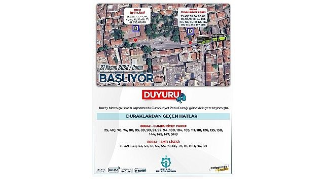 İzmit Cumhuriyet Parkı’nda devam eden Kuzey Metro Hattı inşaat çalışmaları kapsamında, yoğun kullanılan Cumhuriyet Parkı otobüs durağı iki farklı noktaya taşındı. Durağın yeni konumları, İzmit Lisesi önüne ve Akçacami karşı çaprazına yerleştirildi. Bu düzenleme ile toplanma noktası ikiye bölünerek trafik akışının olumsuz etkilenmesi en aza indirildi. Yeni uygulama 21 Kasım Cuma günü itibarıyla devreye girdi.