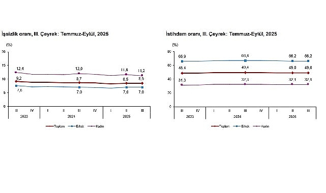 Hanehalkı İşgücü Araştırması sonuçlarına göre; 15 ve daha yukarı yaştaki kişilerde işsiz sayısı 2025 yılı III. çeyreğinde bir önceki çeyreğe göre 26 bin kişi azalarak 3 milyon 10 bin kişi oldu. İşsizlik oranı ise değişim göstermeyerek %8,5 seviyesinde gerçekleşti. İşsizlik oranı erkeklerde %7,0, kadınlarda %11,2 olarak tahmin edildi.