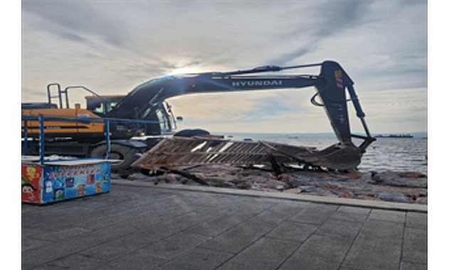 İzmir Büyükşehir Belediyesi, Karşıyaka sahilinde Kıyı ve İmar Kanunu’na aykırı şekilde yapılan izinsiz platformlar ve ahşap iskelelerin yıkım çalışmalarına başladı.
