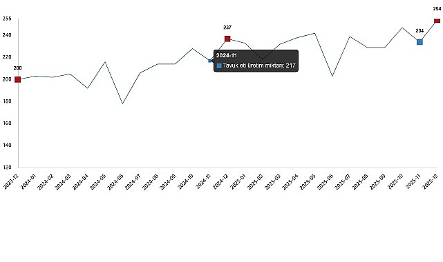 Bir önceki ay 233 bin 887 ton olan tavuk eti üretimi Aralık ayında %8,6 oranında artarak 253 bin 993 ton oldu.
