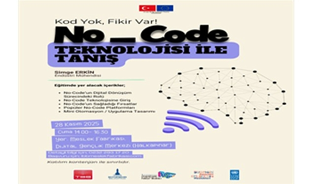 İzmir Büyükşehir Belediyesi Meslek Fabrikası, 28 Kasım tarihinde kod yazmadan mobil uygulama ve arayüz geliştirmeye olanak tanıyan No-Code teknolojisi eğitimi sunacak. Eğitim, endüstri mühendisi Simge Erkin tarafından verilecek ve 16-30 yaş arasındaki gençlerin katılımına açık olacak.